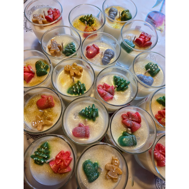 Küünalt kaunistavad erinevad jõuluteemalised detailid ja värviline glitteripuru.